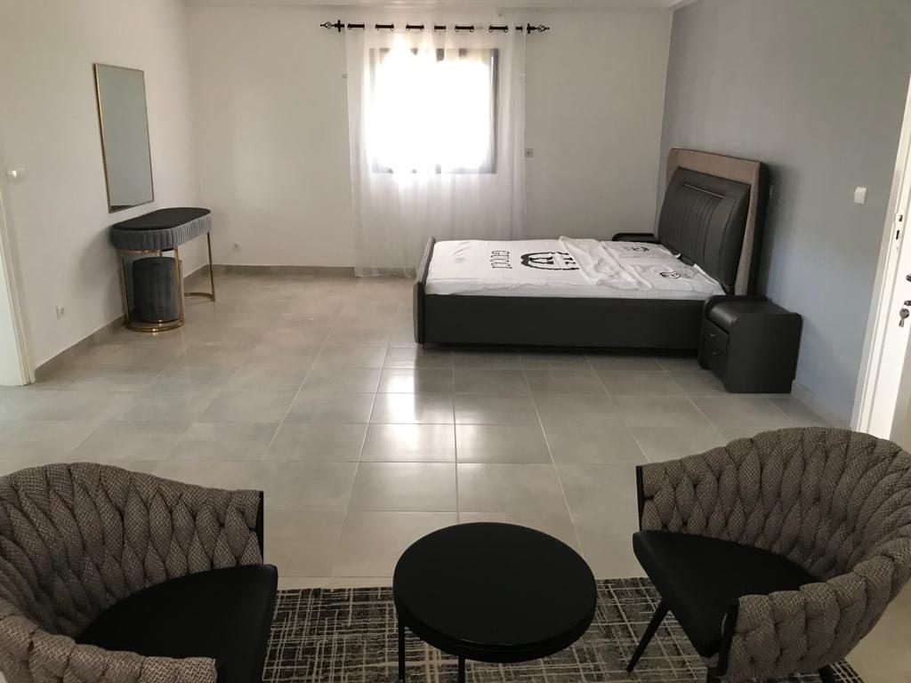La maison comprend également une cuisine fonctionnelle, une agréable terrasse donnant sur un jardin arboré, ainsi qu’une piscine privée, idéale pour profiter pleinement du climat de Saly.