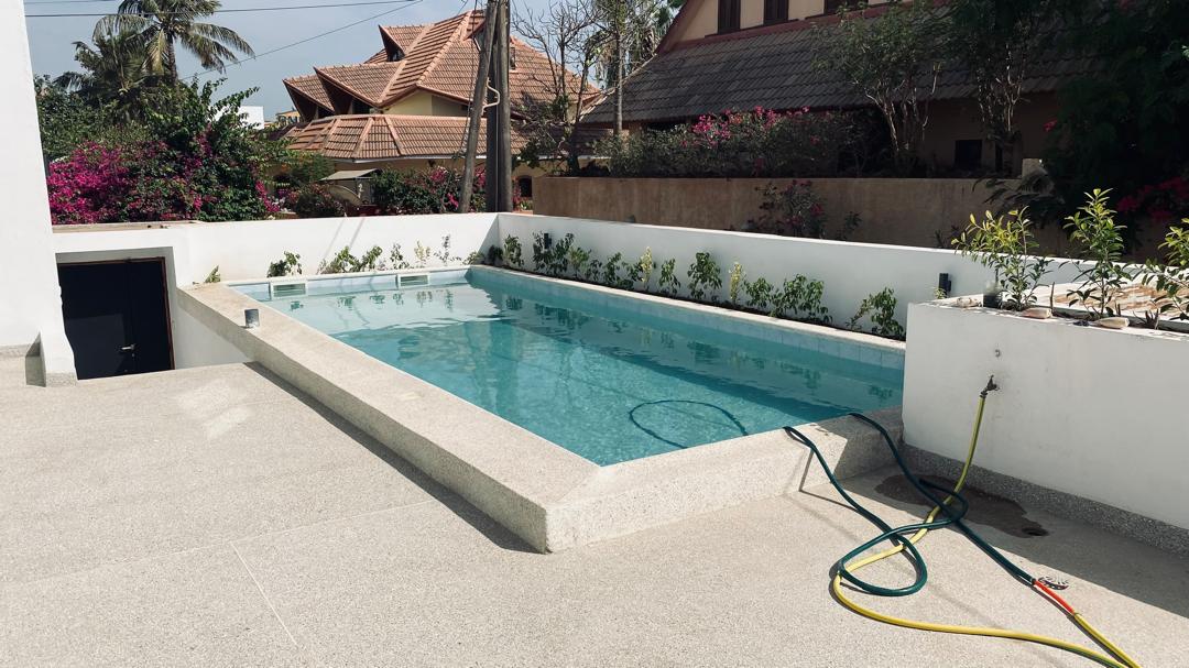 Le projet inclut un garage fermé, une terrasse supérieure, ainsi qu’un espace piscine déjà réalisé, offrant un cadre idéal pour profiter du climat de Saly.